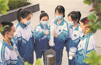 3月23日,河北省邢台市第七中学学生学习雨量测量。
