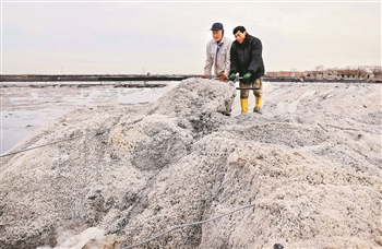 连日来,连云港市数万亩盐田相继进入全面春季扒盐作业阶段。盐业工人抓住晴好天气加紧进行春盐采收,盐田生产如火如荼,万亩盐田呈现处处闹春潮的喜人景象。本报通讯员 王健民 摄