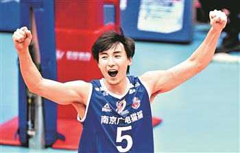 3月22日,江苏南京广电猫猫队球员于垚辰在比赛中庆祝得分。当日,在河北省秦皇岛市国家体育总局秦皇岛训练基地进行的2020-2021赛季中国男子排球超级联赛四分之一决赛中,江苏南京广电猫猫队以3比0战胜河南队。