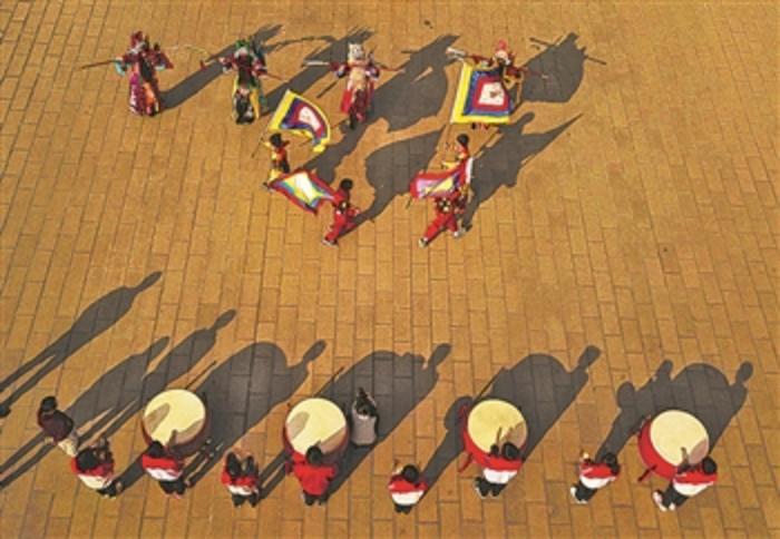 3月23日,贵州省龙里县第三中学师生在排练龙里太平花灯戏(无人机照片)。