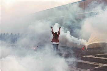 2020年5月30日晚,在美国明尼苏达州明尼阿波利斯市,抗议者在防暴警察施放的催泪瓦斯中与警察对峙。