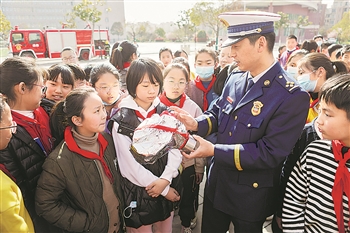 3月25日上午,安徽省淮北市总工会联合市教育工会组织劳模进校园活动,劳模孙浩带领市消防救援大队官兵向学生讲解灭火器操作知识。本报记者 陈华 本报通讯员 马宗耀 摄