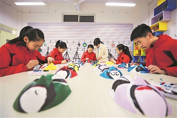 3月27日,河北邢台市内丘县大良村小学师生在绘制戏剧脸谱。