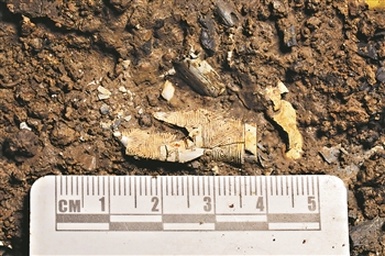图为三星堆考古发掘现场5号坑象牙雕刻残片。四川省文物考古研究院供图