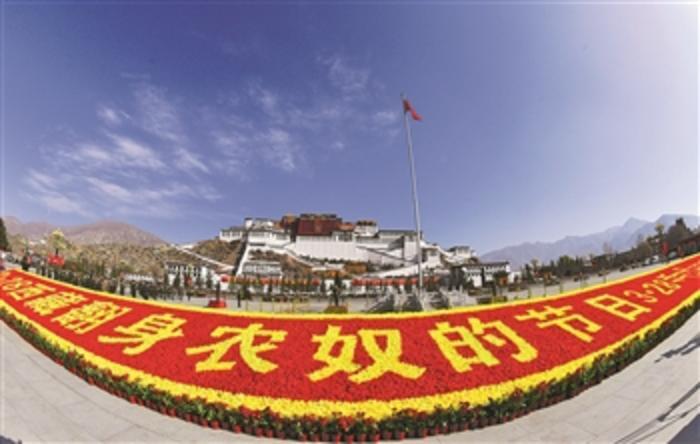当日,西藏各族各界群众聚集在拉萨布达拉宫广场,升国旗、唱国歌,庆祝西藏百万农奴解放纪念日。