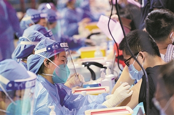 3月28日,在北京大学邱德拔体育馆内,学生们在校医院医护人员和上百名学生志愿者的组织下,有条不紊地接种新冠疫苗。