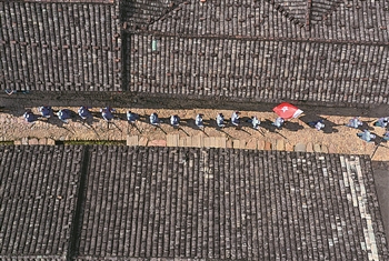 3月28日,人们在福建省龙岩市长汀县中复村红军街学习参观(无人机照片)。