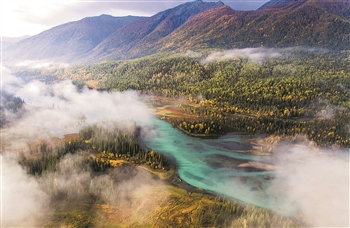 金秋时节,新疆阿勒泰地区喀纳斯景区内的林木与喀纳斯湖相互映衬,美不胜收(2019年9月24日摄,无人机照片)。