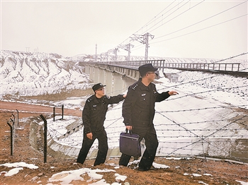 3月30日,阿尔金山普降暴雪,位于大山深处的新疆库尔勒铁路公安处依吞布拉克派出所民警,冒雪在海拔3000米左右的铁路边巡线。 本报记者 吴铎思 摄