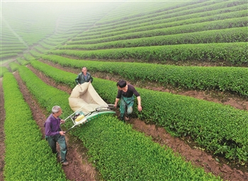 清明节临近,气温升高,武义县10多万亩茶园新芽勃发,满山翠绿。为抢在清明前将头茬春茶采摘下山,1900多台采茶机陆续上山入园赶采新茶。一台采茶机日采摘鲜叶5000多公斤,相当于80至100名采茶工的采茶量。