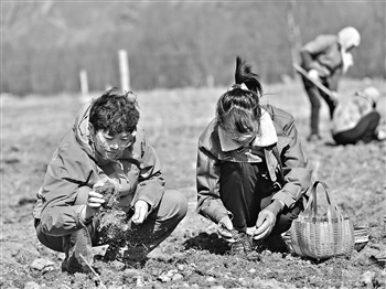 3月27日,青海民族大学生态环境与资源学院教授李军乔(左)带着学生在西宁市湟源县日月藏族乡牧场村农田里查看植物根系。近年来,该学院创新教学模式,将课堂搬到田间地头。学生与农民一起在田间劳作,获取专业知识,提升学科素养。 新华社记者 张龙 摄