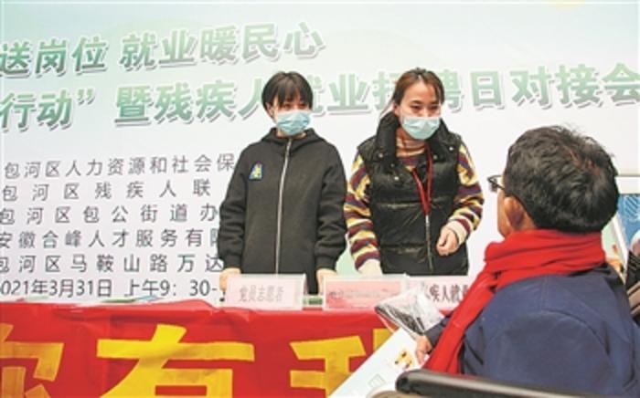 3月31日,志愿者在解答求职者关于就业、劳动保障等方面的问题。当日,安徽省合肥市包公街道在雨花桥社区万达广场开展“春风行动”主题招聘暨残疾人专场招聘对接活动,吸引众多应聘者前来咨询。 新华社记者 曹力 摄