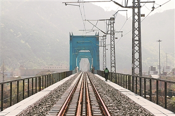 3月31日,金台(金华-台州)铁路正式完工。图为技术人员徒步进行检查作业。