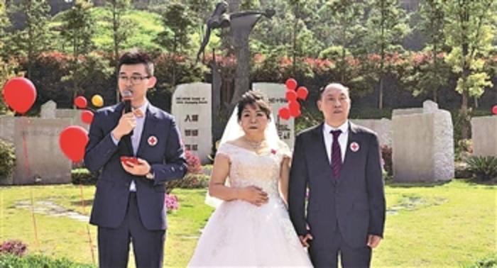 3月28日上午,一场特殊的公益婚礼在重庆市西郊福寿园的人体器官捐献纪念园举行,新郎新娘都是重庆遗体器官捐献宣传志愿者。两人把婚礼现场选在这里,希望以这种方式感恩和纪念所有的捐献者,让更多人关注并加入人体器官捐献事业。