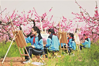当日,河北省邢台市内丘县柳林镇中心小学开展“田间课堂”户外写生,组织美术社团的学生走进百果园,用画笔描绘美丽春色。