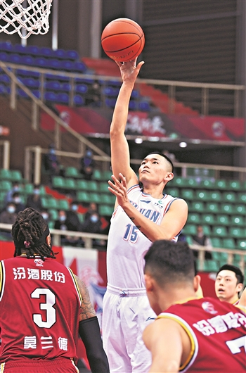 4月5日,福建豹发力队球员陈林坚(上)在比赛中投篮。当日,在浙江诸暨举行的2020-2021赛季中国男子篮球职业联赛(CBA)第四阶段第53轮比赛中,福建豹发力队以129比111战胜山西汾酒股份队。新华社记者 翁忻旸 摄