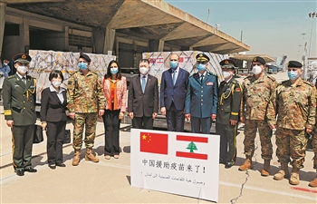 4月6日,在贝鲁特拉菲克·哈里里国际机场,中黎两国人员在中国援助疫苗前合影。