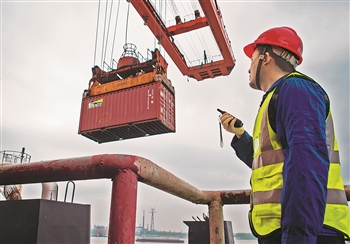 武汉国际集装箱有限公司船舶作业调度员徐敏在武汉新港指挥作业(3月29日摄)。