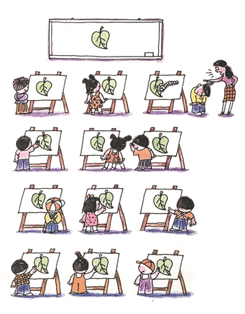 “今天我们一起来画一片树叶,”老师满脸严肃地对同学们讲,“我知道你们都看过树叶,在我们实地写生之前,先来看看今天大家要表现这片树叶的形态和结构,然后我会针对大家在临摹过程中出现的问题做必要的讲解。”话音刚落,孩子们很快便行动起来,课堂秩序也可圈可点。