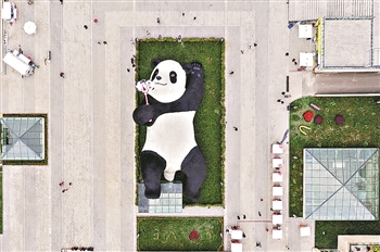 这是4月7日在仰天窝广场拍摄的“自拍熊猫”雕塑。近日,由荷兰艺术家弗洛伦泰因·霍夫曼设计的大熊猫自拍艺术品雕塑在四川省都江堰市仰天窝广场与公众见面。新华社记者 王曦 摄