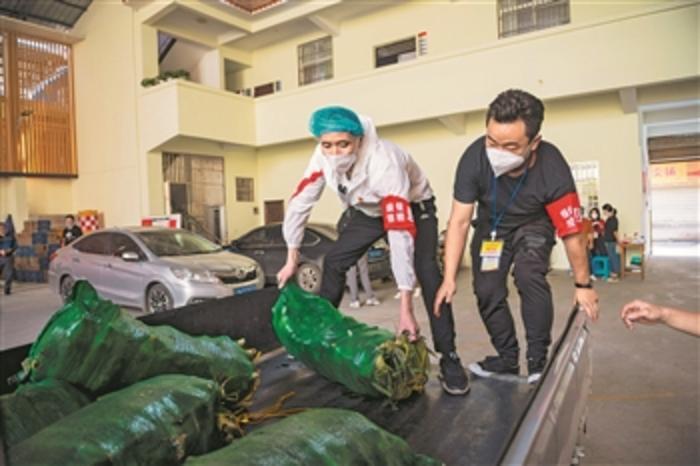 4月9日,周全国(左)与社区工作人员将上级单位协调的生活物资搬运装车,准备分发给社区居家隔离居民。