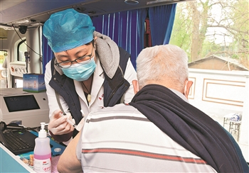 4月11日,在北京市海淀区羊坊店街道小马厂社区新冠疫苗临时接种点,医护人员在移动疫苗接种车上为接种人员接种新冠疫苗。
