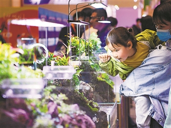 4月10日,小观众在中部(郑州)宠物水族博览会上参观水族用品。