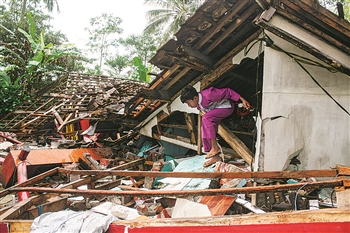 4月11日,一名男孩在印度尼西亚东爪哇省卢马姜一个村庄查看震后废墟。 新华社发(库尔尼亚万 摄)