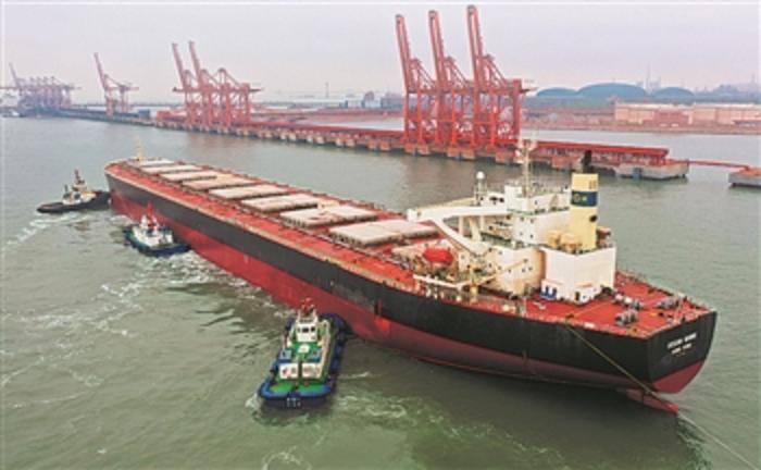 4月12日,一艘轮船在拖轮的协助下向唐山港曹妃甸港区矿石码头靠泊(无人机照片)。