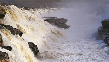 近日,随着黄河上游冰凌消融,位于秦晋峡谷的黄河壶口瀑布水量增大。游人纷纷前来观看“一里壶口十里雷,春水腾雾浪滔天”的壮观景象。 新华社记者 陶明 摄