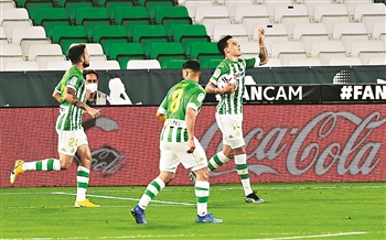 4月11日,皇家贝蒂斯队球员特略(右)在进球后庆祝。当日,在2020-2021赛季西班牙足球甲级联赛第30轮比赛中,马德里竞技队客场以1比1战平皇家贝蒂斯队。新华社/路透