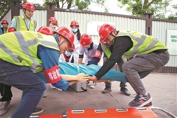 4月13日,事故救援组人员抬“伤员”到安全地带。当日,中铁二十一局集团第五工程有限公司永川房建项目部举行在建项目高处坠落事故应急救援联合演练,从事故发生、事故报告、预案启动、应急救援、应急结束等进行了全过程模拟,让项目管理人员亲身体验、了解发生安全事故时如何进行处置及自救、互救。 陈仕川 摄/视觉中国