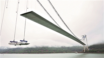 4月7日,重庆新田长江大桥南岸1号段完成钢箱梁吊装空中荡移72米的施工环节。碧波荡漾的长江水面上,220吨重钢箱梁在跨缆吊机的作用下稳稳起吊,在高空实现连续二次荡移,完成“空中接力”高难度技术动作,精准定位于桥面安装点。
