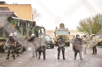 4月13日,士兵和警察在美国明尼苏达州布鲁克林森特市警察局外警戒。