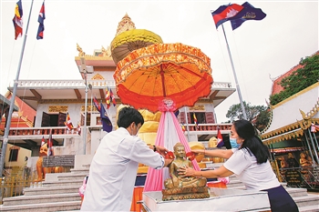 4月14日,人们在柬埔寨金边一个寺庙祈福,迎接柬埔寨新年。4月14日至16日是柬埔寨新年,部分民众前往寺庙祈福迎新。由于新冠疫情持续蔓延,柬卫生部呼吁民众在家庆祝新年。 新华社发(索万纳拉 摄)