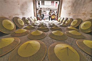 村民在贵州省三穗县瓦寨镇上街村再成斗笠加工厂晾斗笠(4月11日摄)。