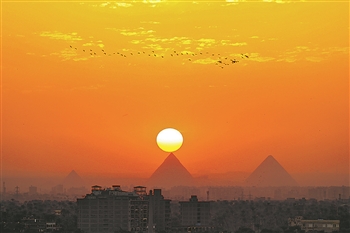 这是4月14日从埃及开罗拍摄的吉萨金字塔群日落景色。