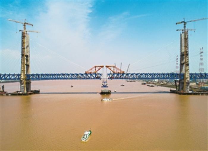 当日,在浙江台州的杭绍台铁路建设施工现场,随着最后一片钢梁吊装完成,杭绍台铁路控制性工程椒江特大桥顺利合龙。