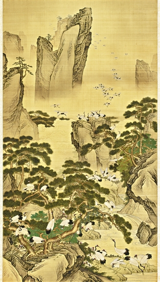 《百鹤图》 明代画家吕纪(1429~1505)所作。吕纪,字廷振,号乐愚,鄞(今浙江宁波)人,擅花鸟,初师边景昭(字文进,明代画家),远宗南宋院体格,延续了黄筌(字要叔,五代西蜀宫廷画家)工整细致的画风及勾勒笔法,并予以发扬。其画呈两种面貌,一是工笔重彩,设色明丽,气韵生动,多绘凤鹤、孔雀、鸳鸯之类,辅以浓郁花树、坡石以及滩渚流泉为背景,既具法度,又富生气,笔法严谨,画面绚丽。另一类为水墨写意画,笔势劲健挥洒,点染简练奔放,接近林良(字以善,明代画家)的风格,富有气势和动感,自然入妙。 图文 络因