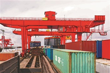图为4月16日,中欧班列集装箱在紧锣密鼓进行调配装车作业。唐哲 摄