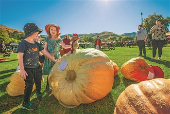 4月18日,在新西兰南岛克赖斯特彻奇的小河镇举行的南瓜节上,孩子们和参选“最大南瓜”的大南瓜玩耍。