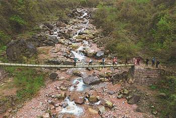 4月18日,徒步爱好者沿着大相岭茶马古道,通过一座吊桥。