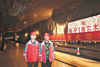 2011年,毛祥国(左)与同事在新关角隧道里合影留念。许家安 摄