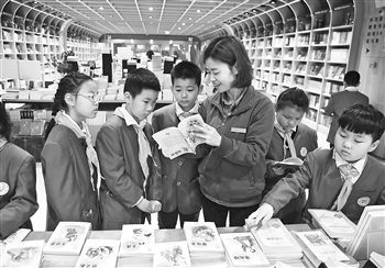 4月17日,阅读空间工作人员向孩子们介绍红色经典图书。