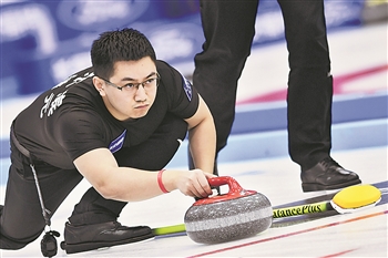 4月19日,哈尔滨市队选手王靖元在比赛中掷壶。当日,在青海多巴国家高原体育训练基地进行的中国冰壶精英赛中国公开赛(中国·青海)男子乙组比赛中,哈尔滨市队以8比3战胜青海队。新华社记者 张龙 摄