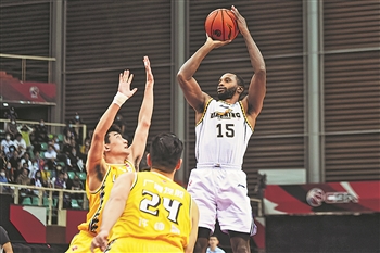 下图为辽宁本钢队球员弗格(右)在比赛中投篮。新华社记者 江汉 摄