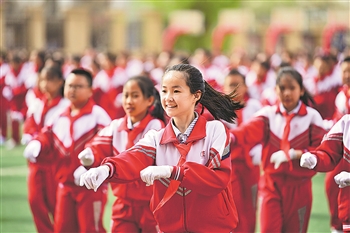 4月19日,呼和浩特市赛罕区锡林南路小学分校学生参加会操比赛。当日,内蒙古自治区呼和浩特市赛罕区锡林南路小学分校举办“体教融合 美育少年”主题会操比赛,学生们在活动中尽情展示韵律操,享受健身运动带来的欢乐。新华社记者 王正 摄