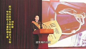 4月16日下午,在全国工会劳模工匠宣讲活动首场报告会现场,“中国民航英雄机长”刘传健分享了2018年5月14日3U8633起飞前的一个细节。刘传健说,当他做好起飞前的一切准备后,给同事发了一条短信:“逃生绳长度:5.5米。”前一天,他与同事讨论逃生绳长度,晚上睡觉前还记着这件事,便翻开飞行资料进行查阅。
