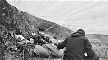 遇到极端天气时,陇南市文县的野外巡护员在临时搭建的休息区内休息。