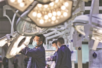 4月23日,山东淄博,在新华医疗洁净技术厂车间,工人正在加紧生产手术无影灯。